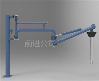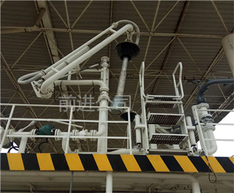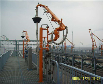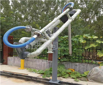 密閉(bì)式頂部裝卸臂由5個旋轉接組成回轉**,液相4個,氣相1個。氣相一般爲DN50,液相根據客戶需要的流量選擇 。氣相在轉接處使用金屬軟管連接,保證鶴管的旋轉靈活性。鶴管液相接口朝下,氣相接口朝上,一般氣相會多台彙總在一個主管上,如果單台排空的話,需要加帶雨帽的阻火器,**管道進入點燃源。垂管上有一個錐形密封帽,裝車時垂管插到槽車的頂部灌口,密封帽壓實在灌口處 ,鎖緊外臂鎖緊杆(或者氣缸壓緊,在和油氣回收配合使用時,建議鶴管增加氣缸,達到充分密閉(bì)的作用,因爲空的槽車在裝車時物料逐漸增多 ,槽車輪胎壓扁,槽車降低,密封帽就不能很好的密封瞭(le),必須有氣缸對密封帽有一個壓力,才能使密封帽始終跟緊灌口。達到有效密閉(bì)的效果 ,油氣回收需要密閉(bì)效果達到90%-95%)密封帽密閉(bì)後,槽車裏氣化的介質就能通過鶴管上的氣相管道排空或者抽入油氣回收系統